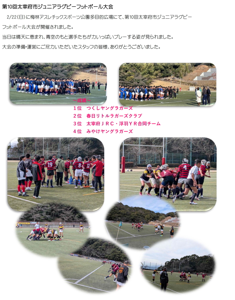 第10回太宰府市ジュニアラグビーフットボール大会![]() 太宰府JRC・浮羽YR合同チーム(赤の段柄ジャージ)VSみやけヤングラガーズ(青色ジャージ) 太宰府JRC・浮羽YR合同チームが勝利をしました。 2025太宰府市民少年軟式野球大会![]() 令和7年度第42回太宰府市民ソフトボール大会結果![]() 令和7年度太宰府市民バレーボール大会